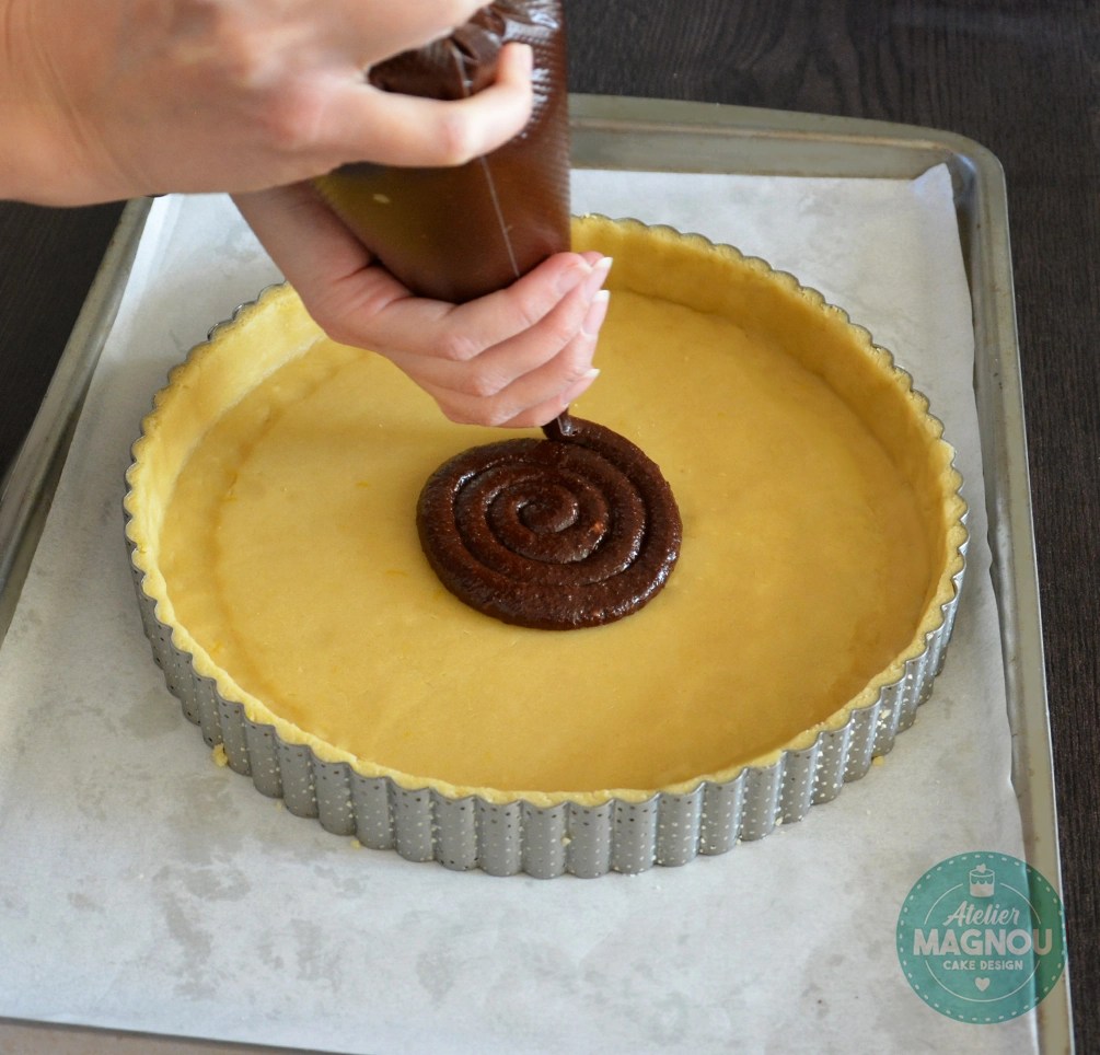 Con la ayuda de una manga pastelera distribuya el relleno en toda la torta dejando 1c m de borde descubierto.