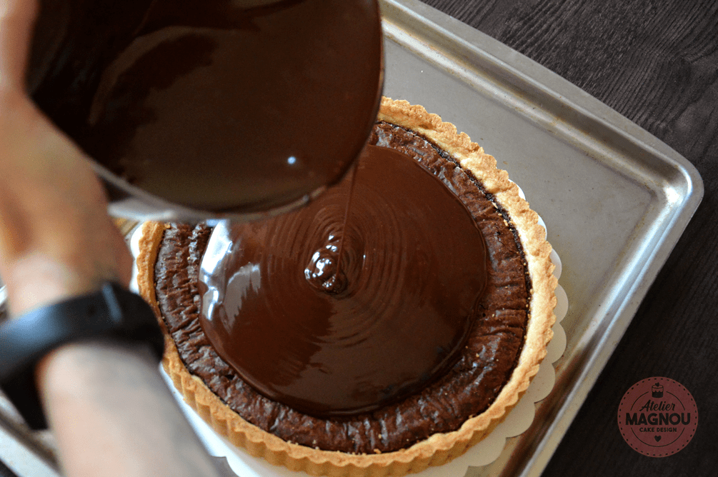 Verter el ganache. Para que quede bien liso, golpea ligeramente la placa. Esto también eliminará las pequeñas burbujas de aire que puedan aparecer. Si buscas la perfección, elimínalas con un palillo de dientes.