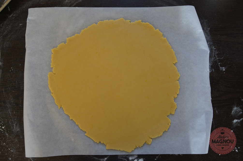 Espolvorear la superficie de trabajo con un poco de harina y estirar la masa con un rodillo hasta formar un círculo de 2mm de grosor. Enrollar la pasta en el rodillo y desenrollar sobre el aro de repostería, de esta manera se evitará que se deforme.